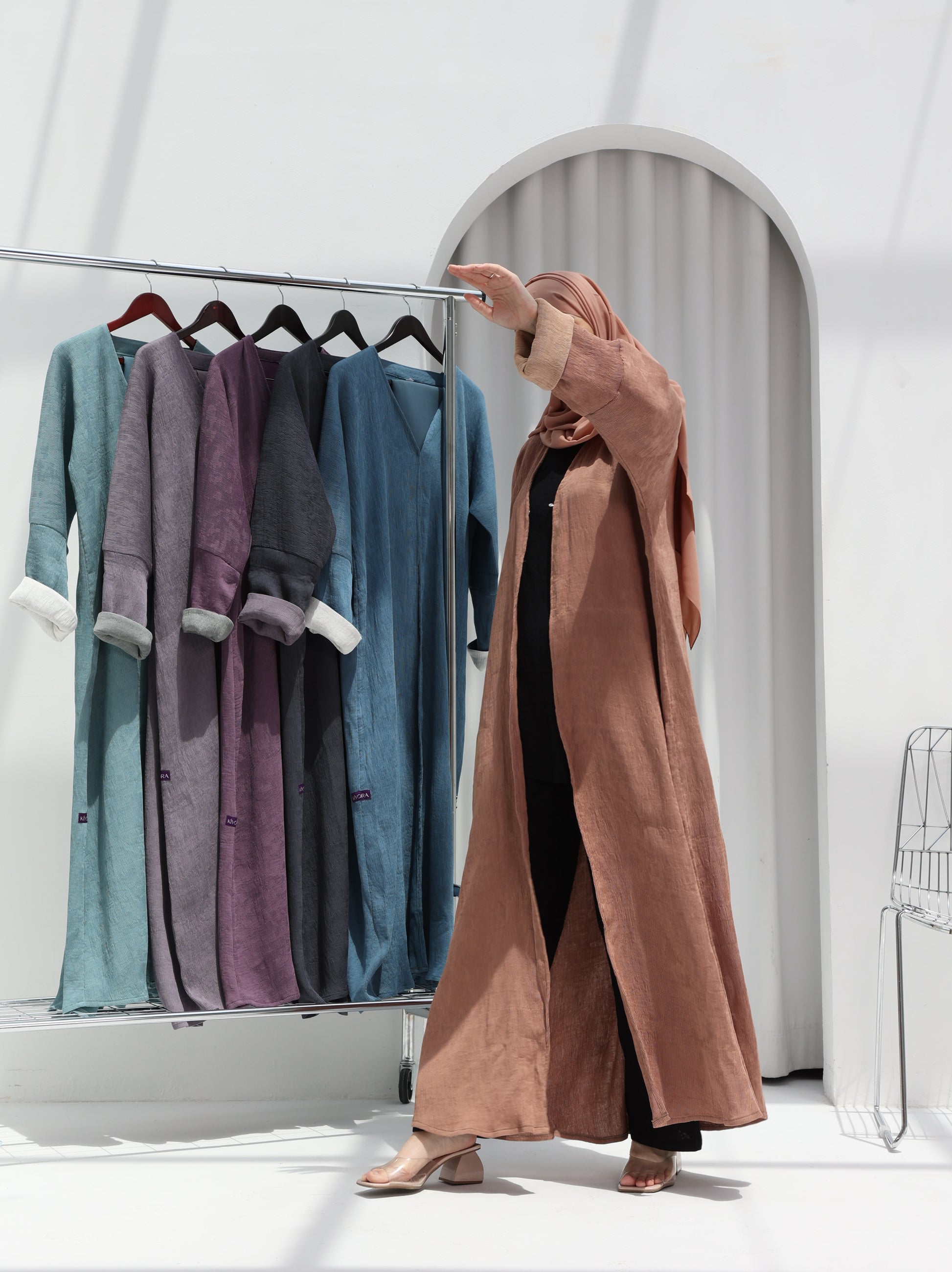 Kiyora’s Autumn Abaya – tailored from premium Coco Pleated fabric, with a dual-tone effect, revealing a contrasting color when the sleeves are folded for a modern, versatile touch.