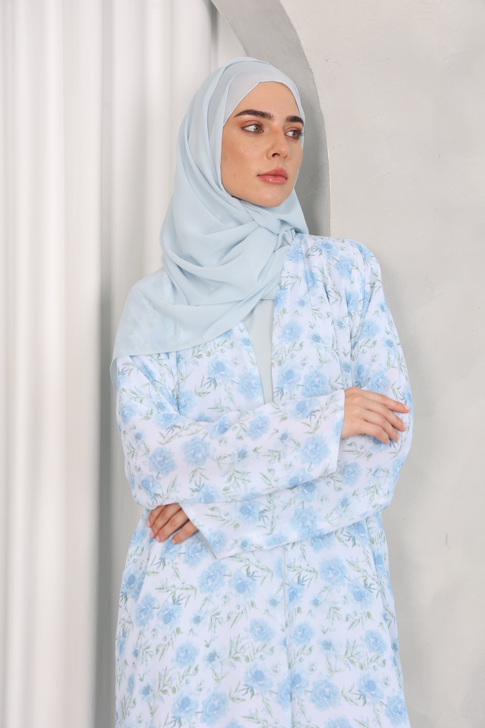 Kiyora's Baby Blue Abaya features delicate blue floral patterns on a flowy fabric.