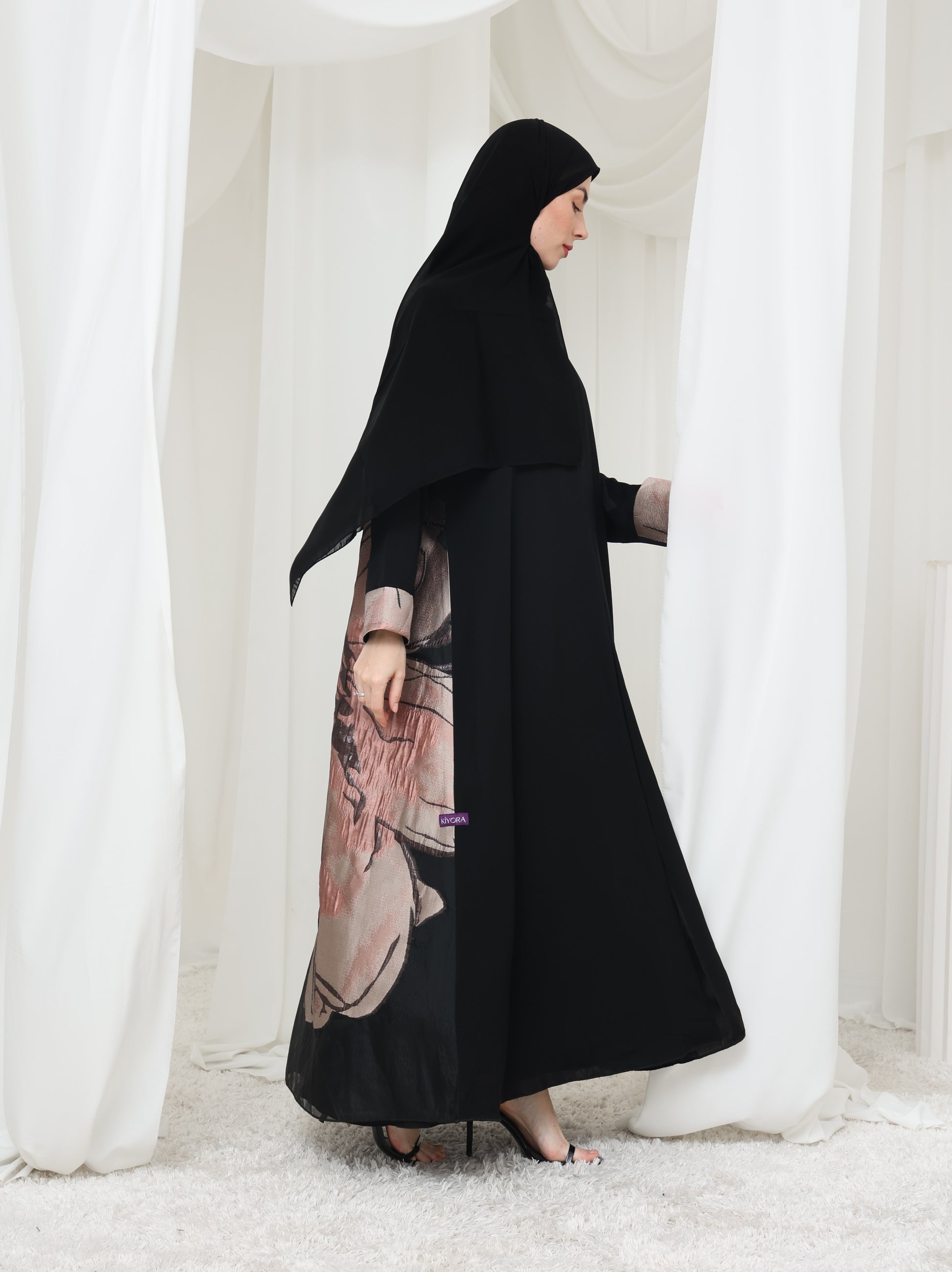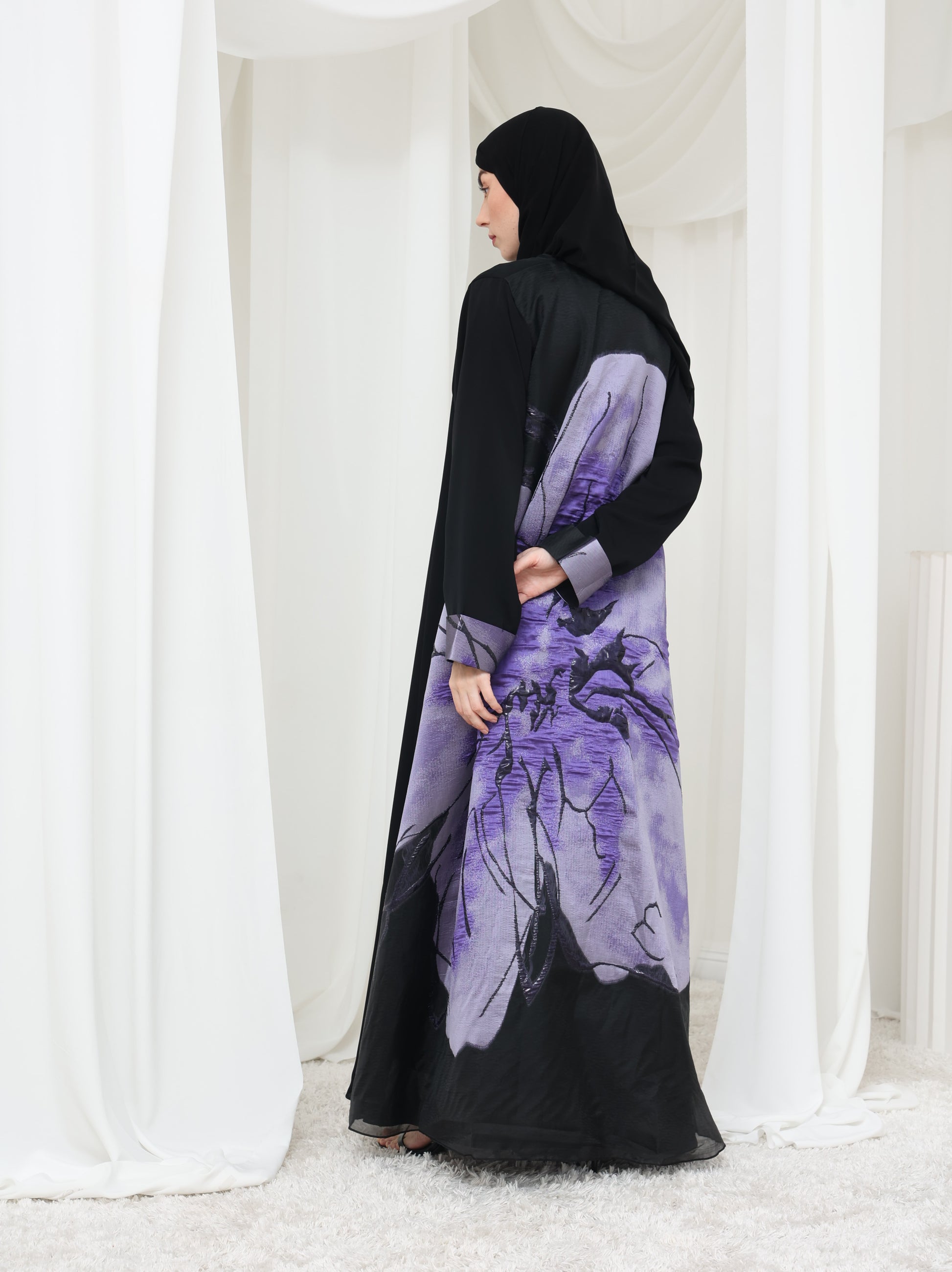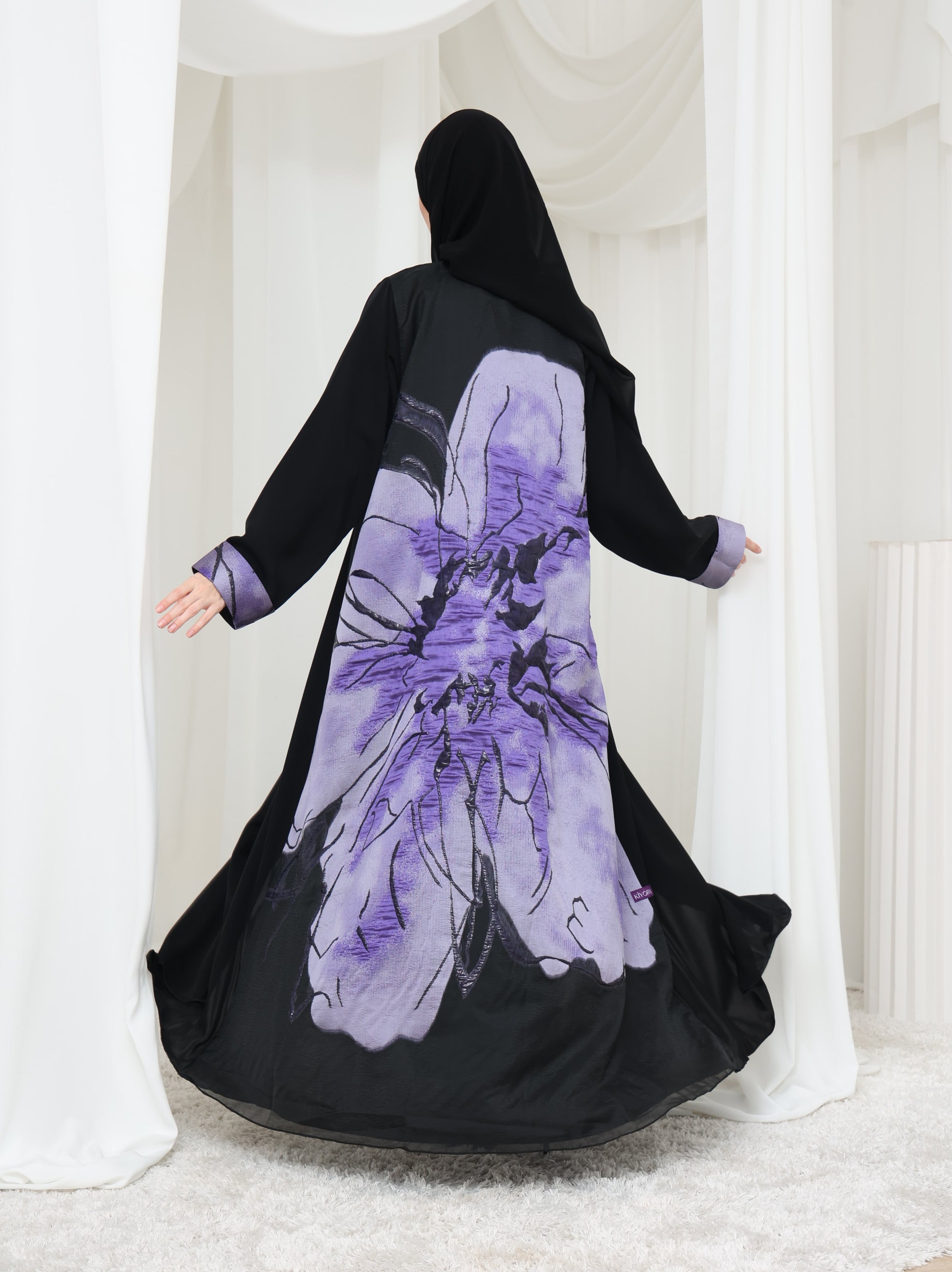 Flowy abaya with a soft floral print on the back and delicate cuff detailing, combining casual comfort with refined elegance.