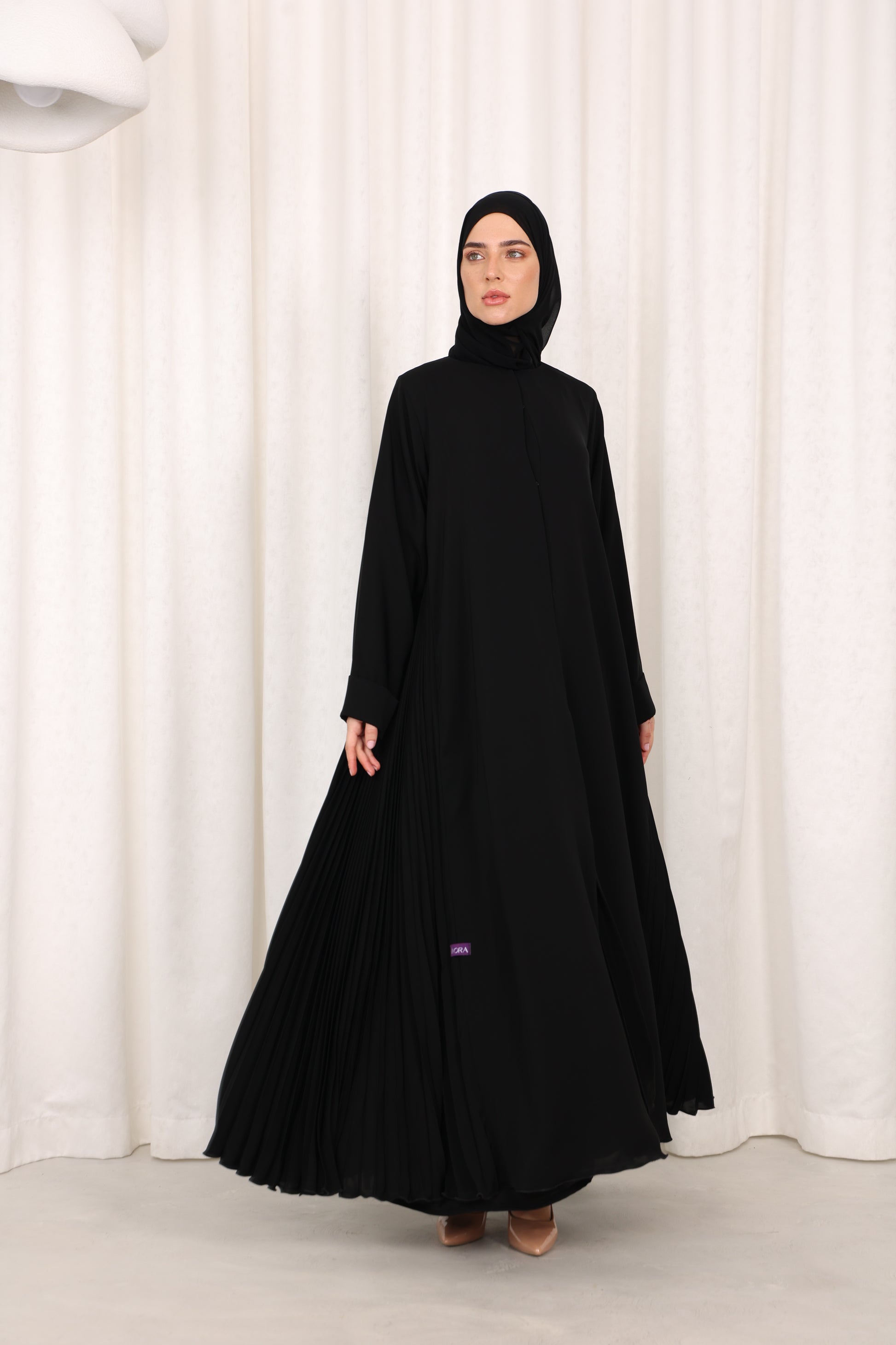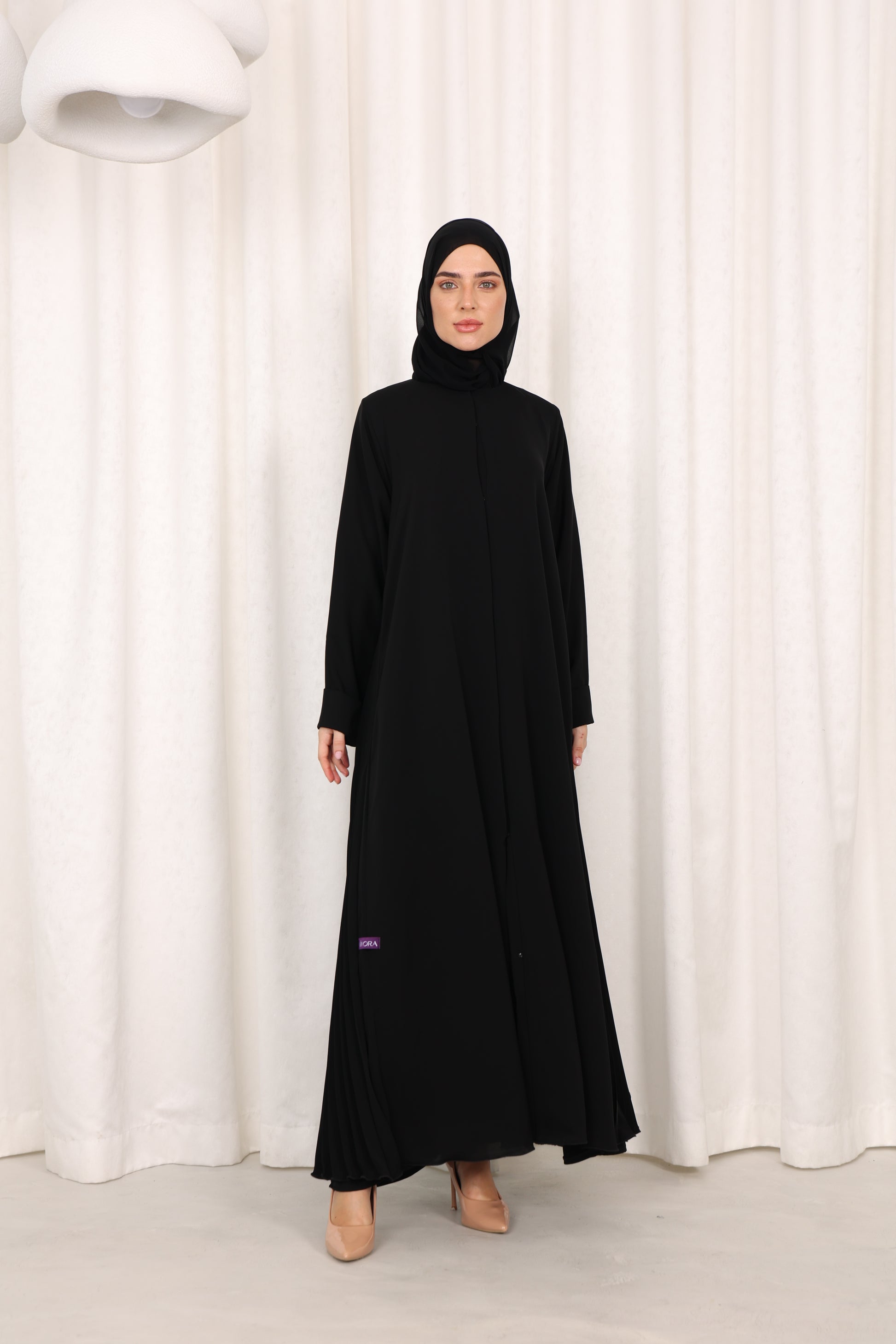 This abaya features elegant pleated fabric on both sides. It’s crafted with front buttons, allowing you to wear it open or closed.