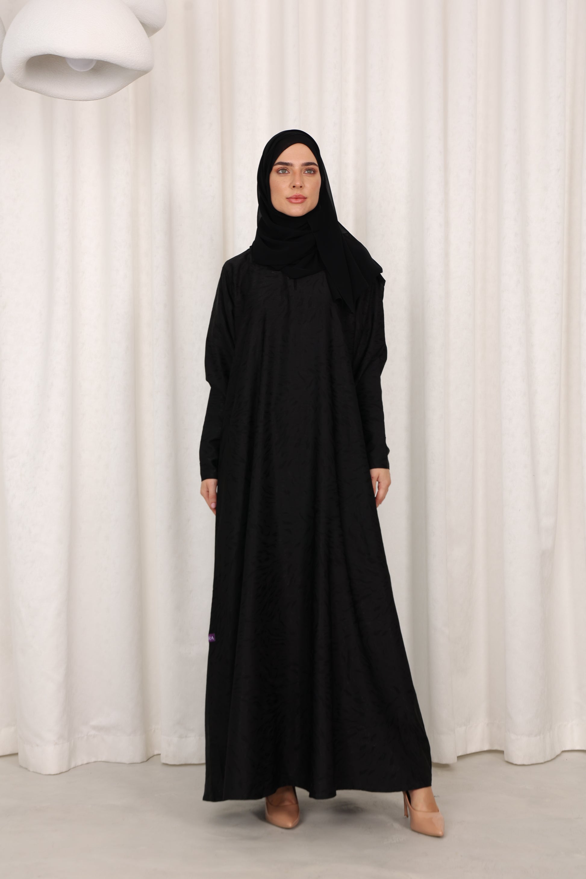 This fully closed abaya is designed with subtle patterns and made from a non-polyester fabric, giving it a soft, natural feel. It’s a breathable and stylish choice for those who value comfort and elegance in their everyday look.