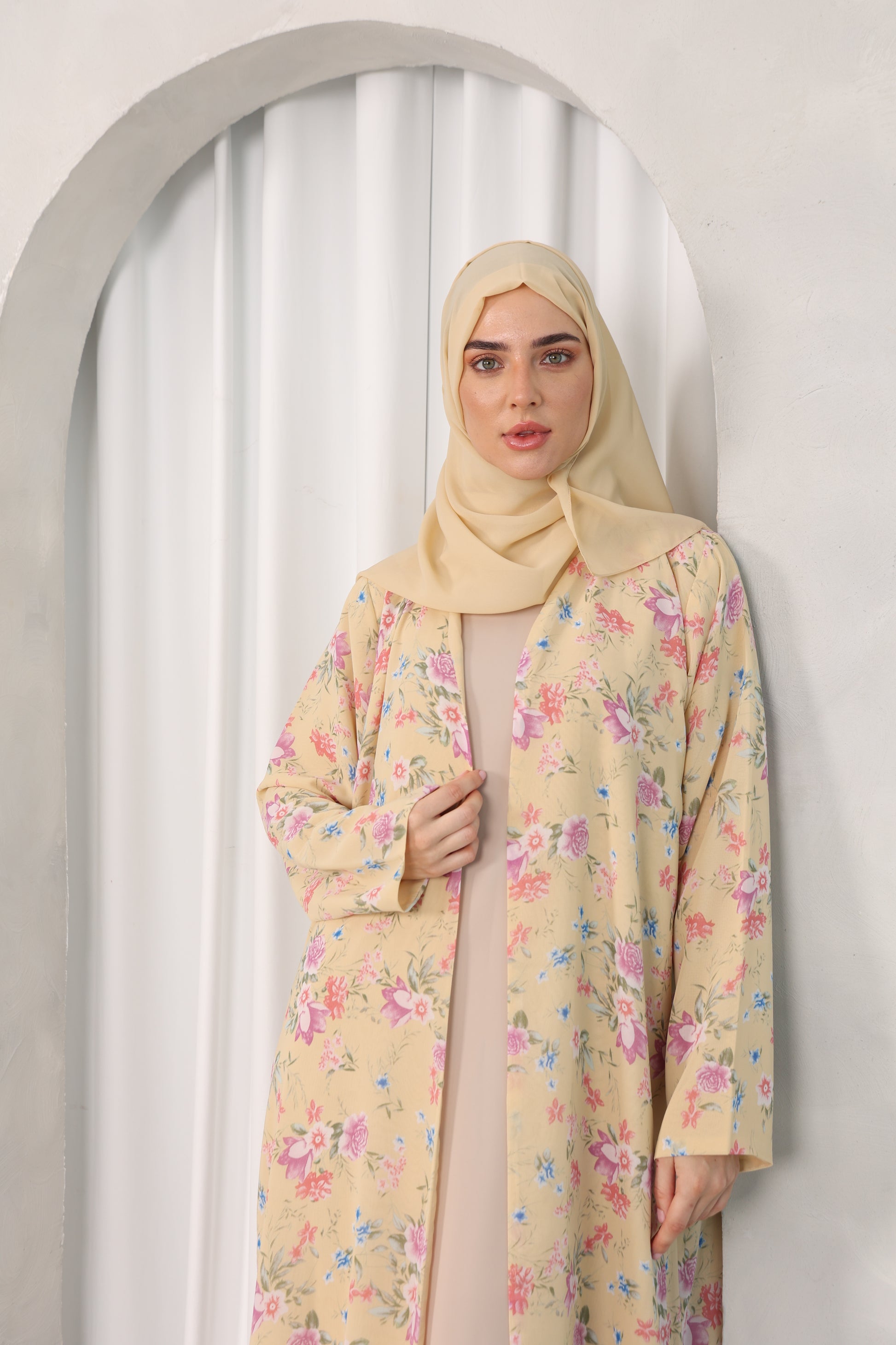Yellow Bloom Abaya -A lightweight, flowy design adorned with soft yellow and pink floral patterns.