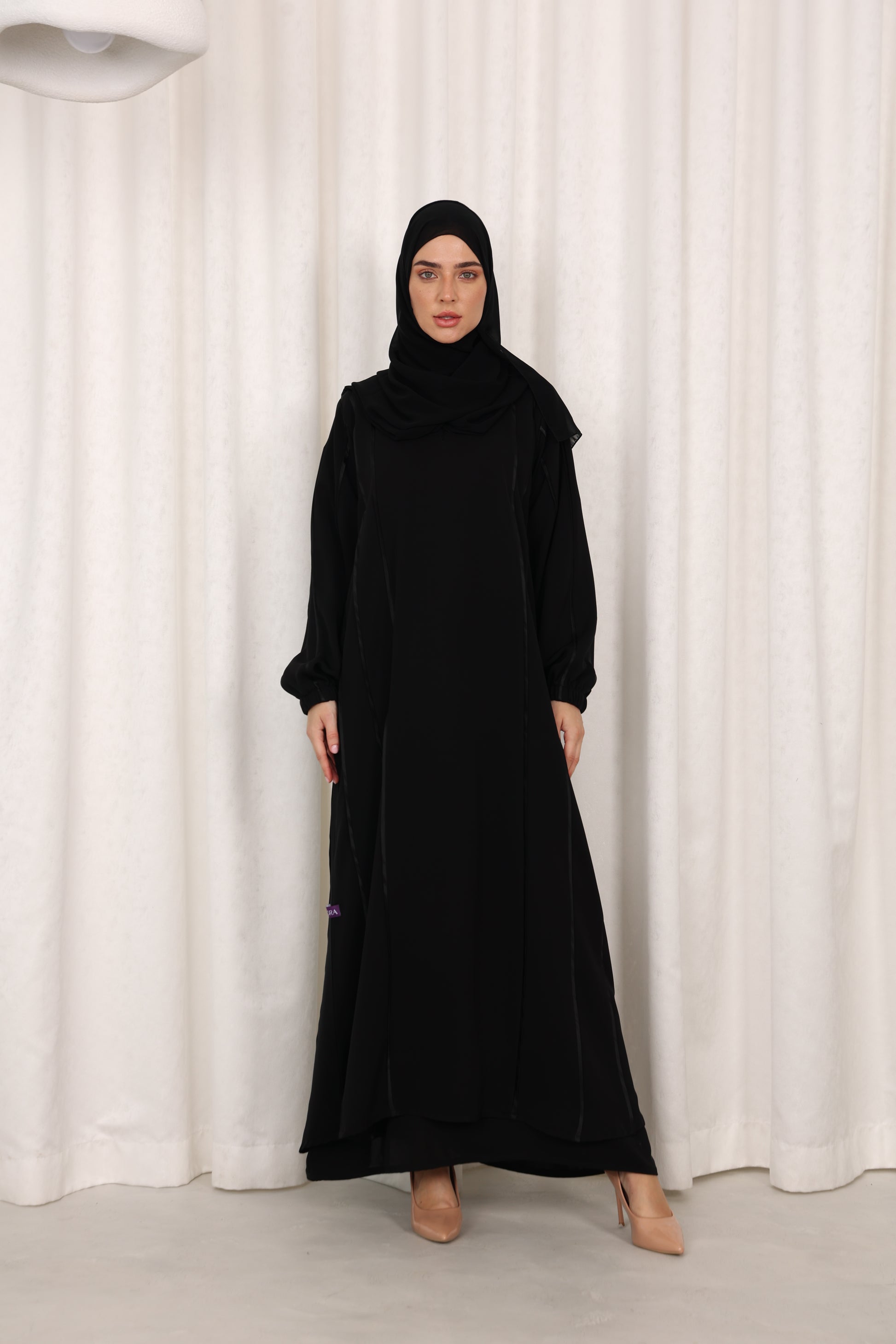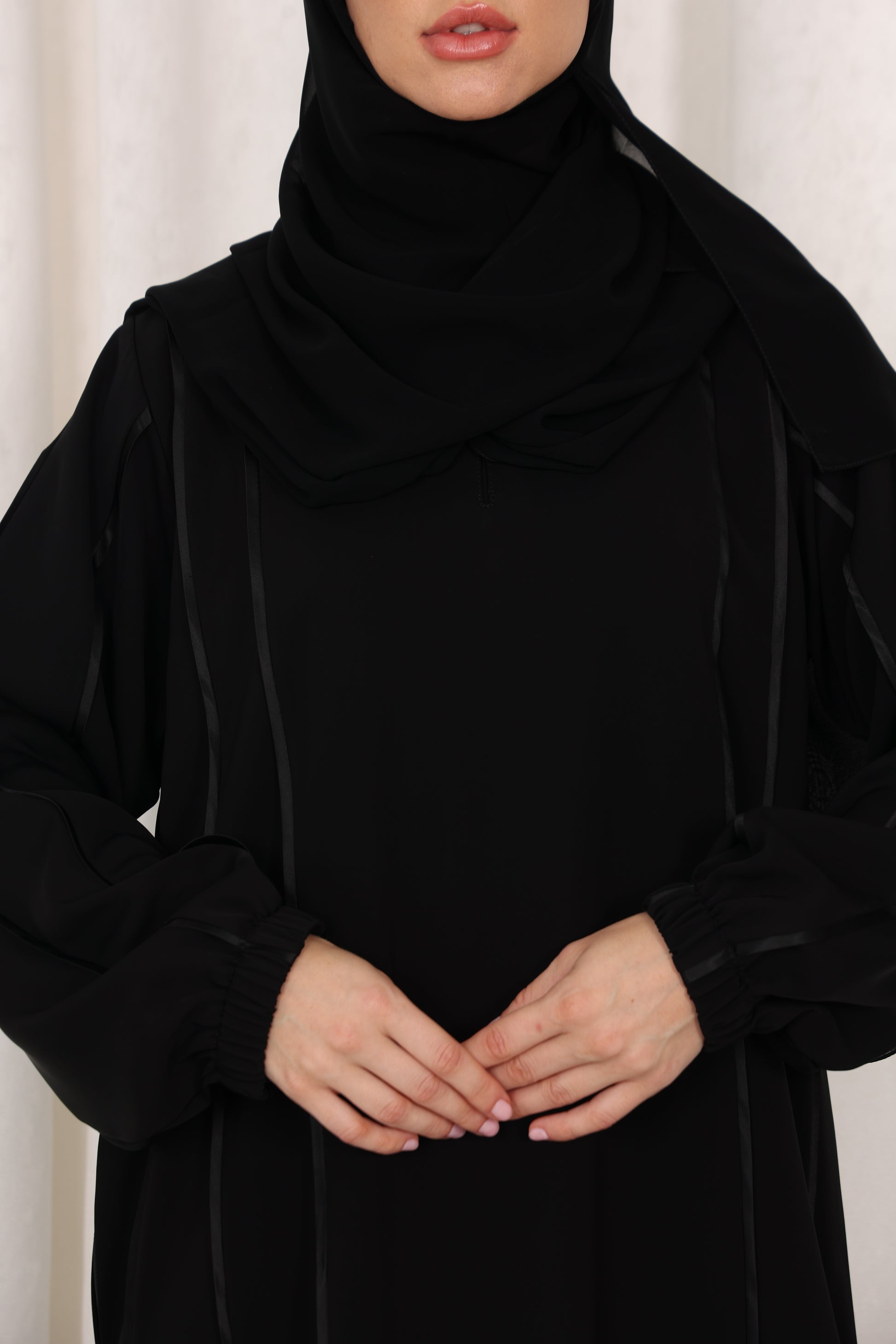 This abaya features a fully closed design, with a discreet zipper pocket for added convenience. Perfectly practical and elegant for Ziyara.